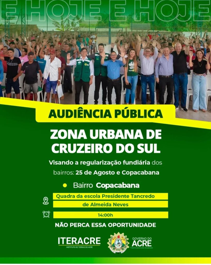 O Governo do Estado, por meio do Instituto de Terras do Acre (ITERACRE), realizará nesta segunda-feira, às 14 horas, uma audiência publica na zona urbana de Cruzeiro do Sul, voltada para os moradores dos bairros 25 de Agosto e Copacabana.