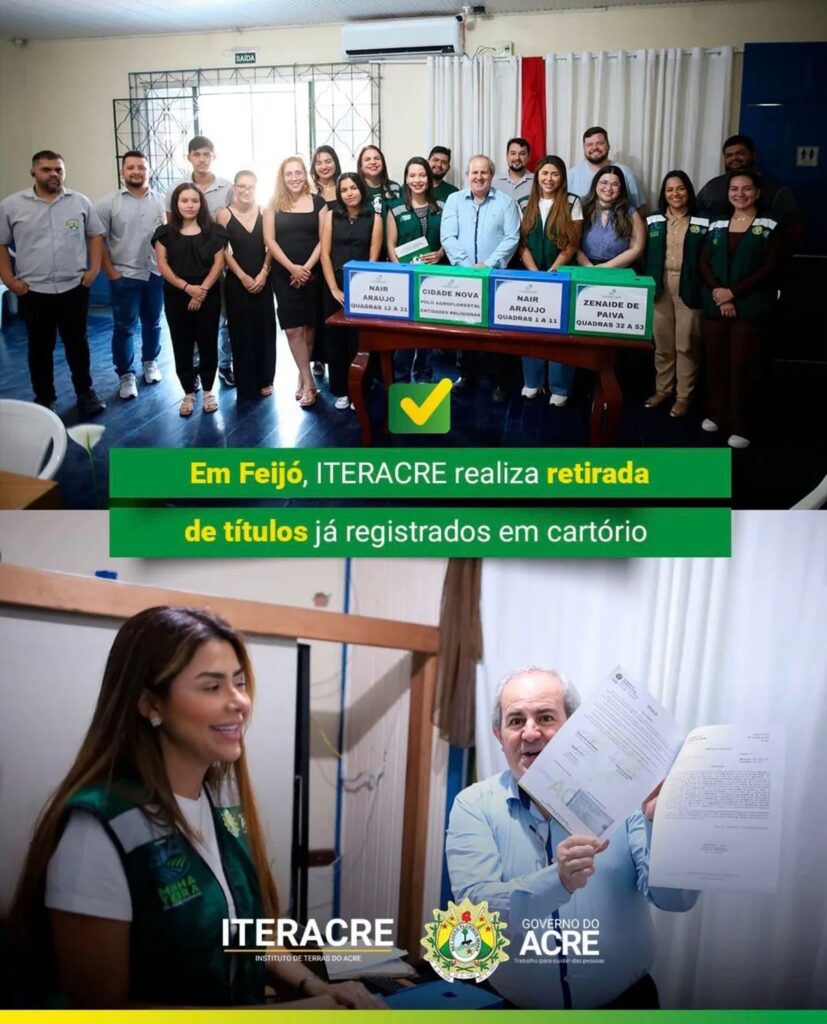Nesta quarta-feira, 27, o Instituto de Terras do Acre (ITERACRE) esteve no município de Feijó para realizar a retirada de títulos definitivos já devidamente registrados em cartório.